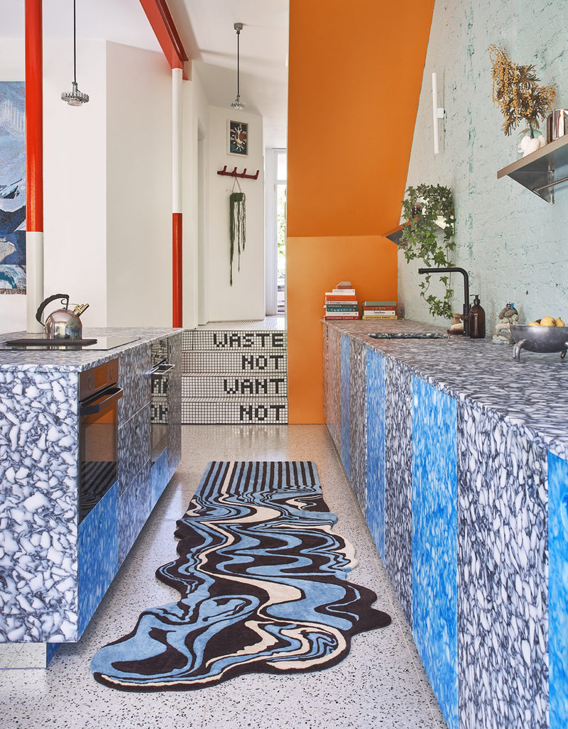 The outcome is a total celebration of the materials used in Khan’s designs featuring brutalist steel and concrete features. Craftsmanship and raw materials are echoed in the selection of furnishing pieces, with many being custom made by manufacturers, including our very own Melting in Red, Diagonal Melt and Pass The Plate hand knotted rugs.