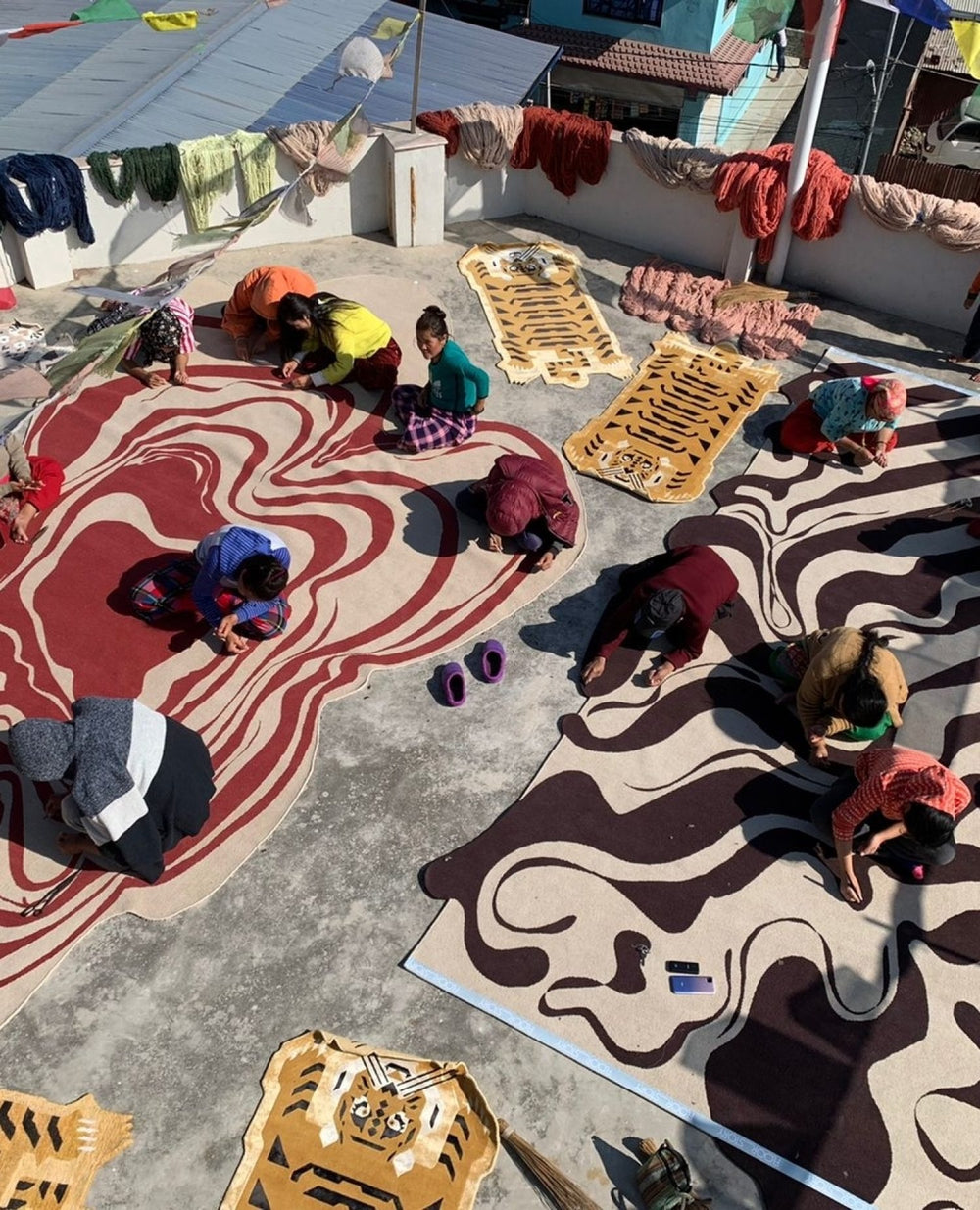Image of weavers trimming oversized Henry Holland shaped rugs in Nepal