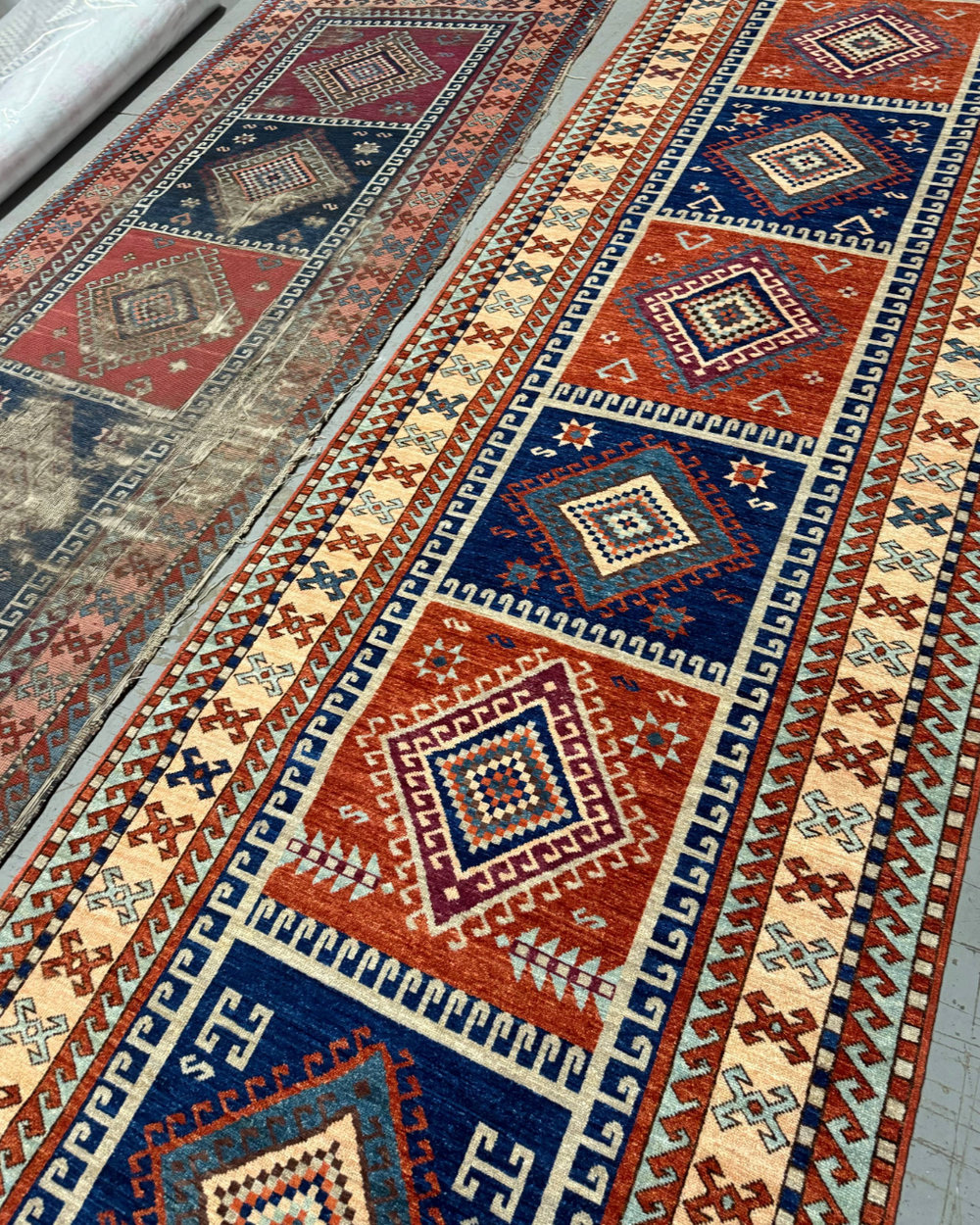 The original rug next to the hand knotted remake.