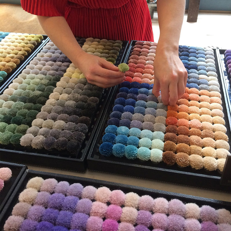 If you need more detailed guidance in the colour selection process, we offer colour consultation sessions where you can hand pick from our East London showroom with our design team. Outside the curated selection included in the trade pom box, We have a further total of 3000 wool colours and 1000 viscose poms to choose from.