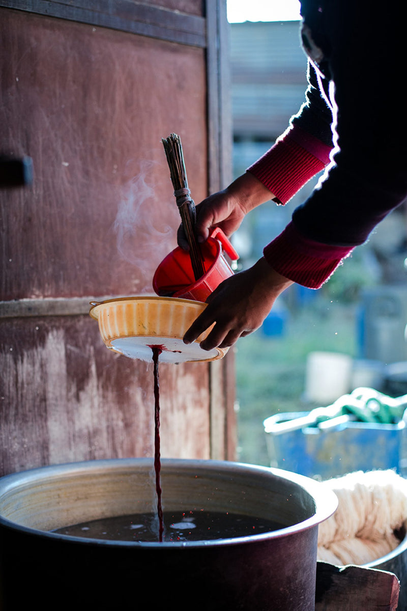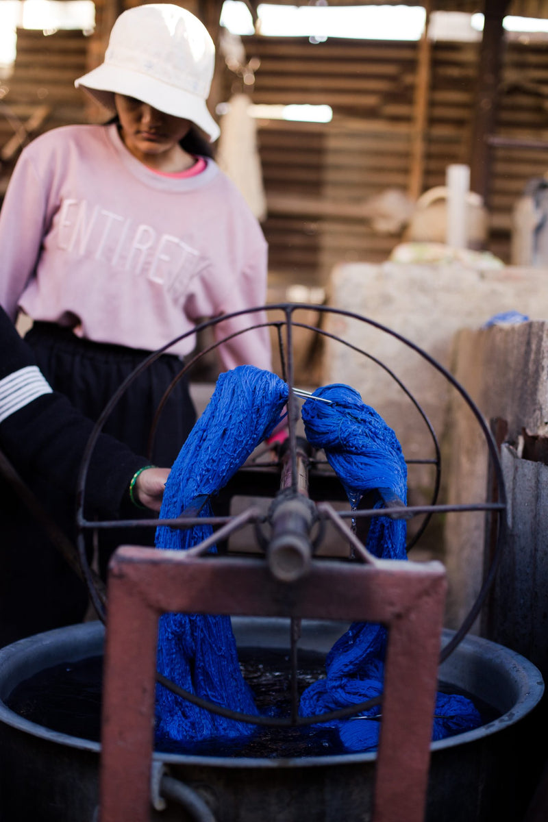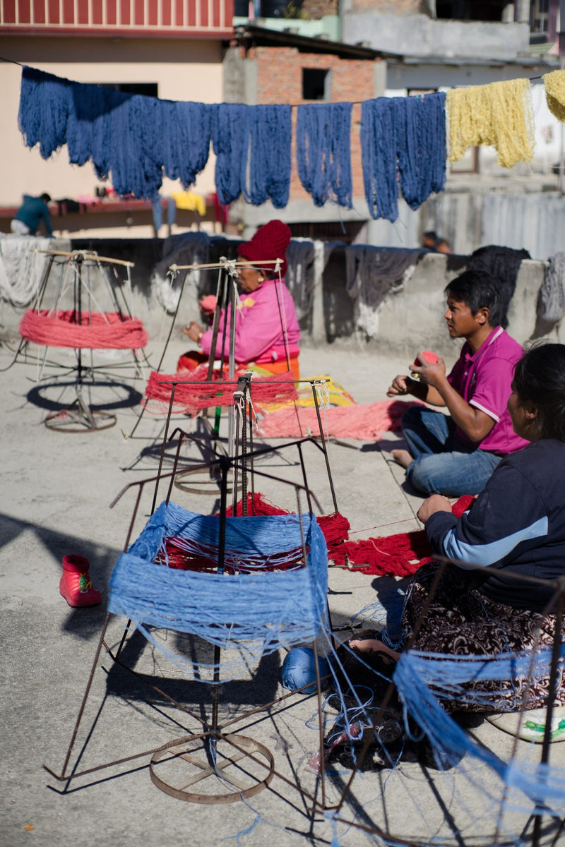 The raw materials that have been weighed out are then sent to the Dye Master and their team, who will at first test small batches to match the colours of the poms we have selected in London. When they have made the match they use the formula they have created to dye the rug materials. After the materials have been dyed, washed and dried, it is then sent back to the weavers who spin the hanks of material into balls.
