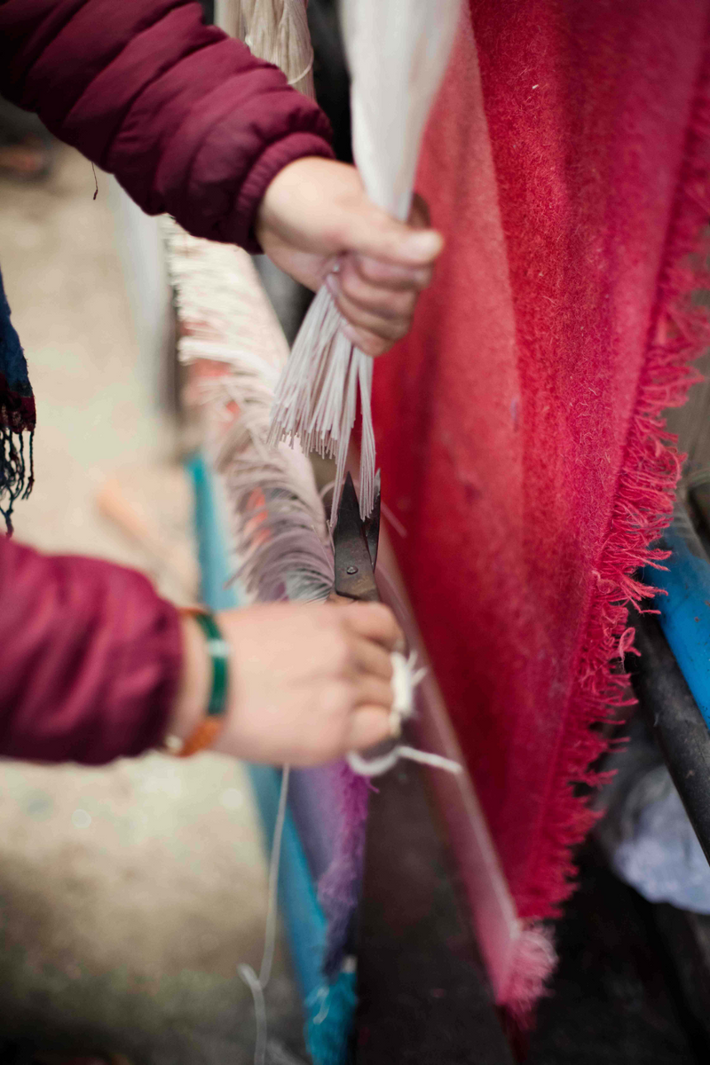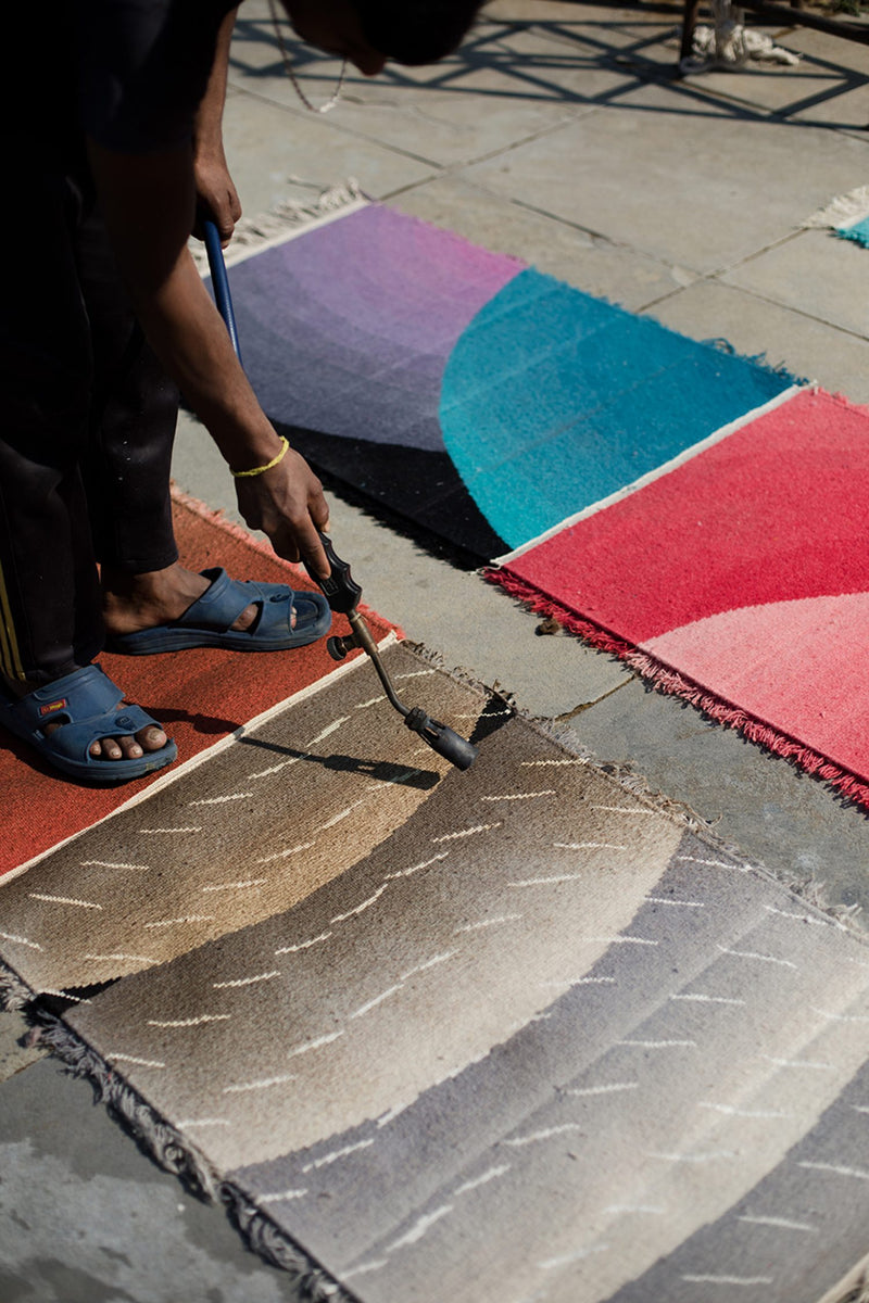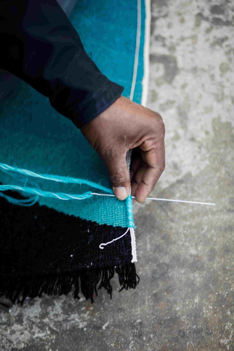 When the rug is completely dry it is brought back to our own facilities to go through final carving, finishing and the binding stage, which means that the edges of the rug are sewn. Pictures of the rug are then sent to us in London so we can provide feedback on the finishing stages and if anything additional is needed. The rug is compared to the initial spec sheet in detail to make sure all instructions for the design were followed before being labelled and packed for shipping.