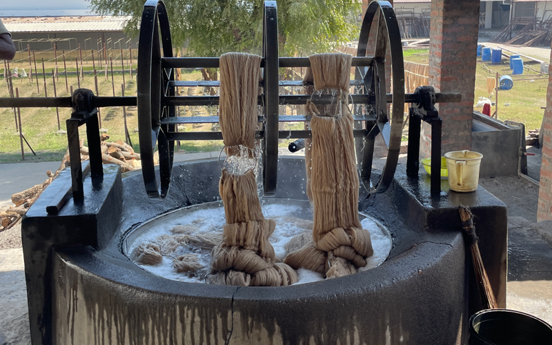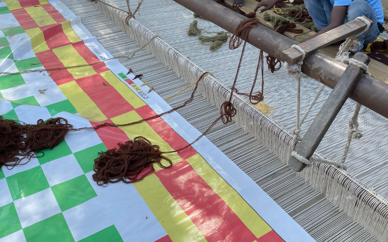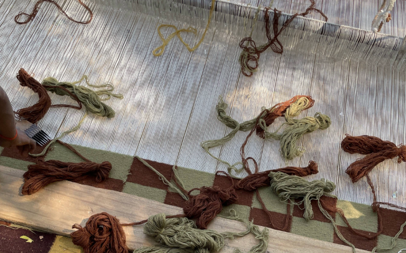 Once the frame is constructed, cotton warp yarns are carefully threaded vertically, this takes quite some time to ensure the correct tension to create a high quality weave.