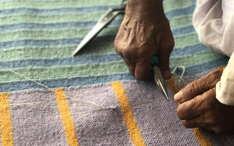 After the rug is woven, the work of tidying up any joints in alternating colours in the design is done with meticulous attention to detail. A needle helps direct any loose threads in the right direction for a seamless finish. The edges are also hand bound using a needle and wool to make a tidy and cohesive outline to the rug.