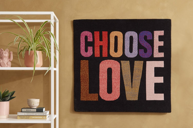 This wall hanging is part of a two-part collaboration between Choose Love and FLOOR_STORY. The letters were created from wasted tibetan wool from the rug making process and curated by the weavers. Creating both a more sustainable product and a celebration of the rug-making community.