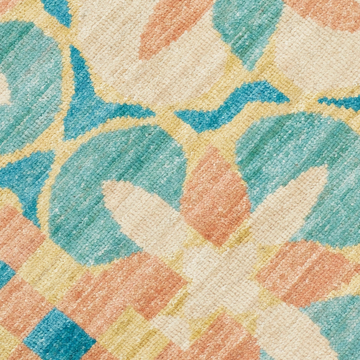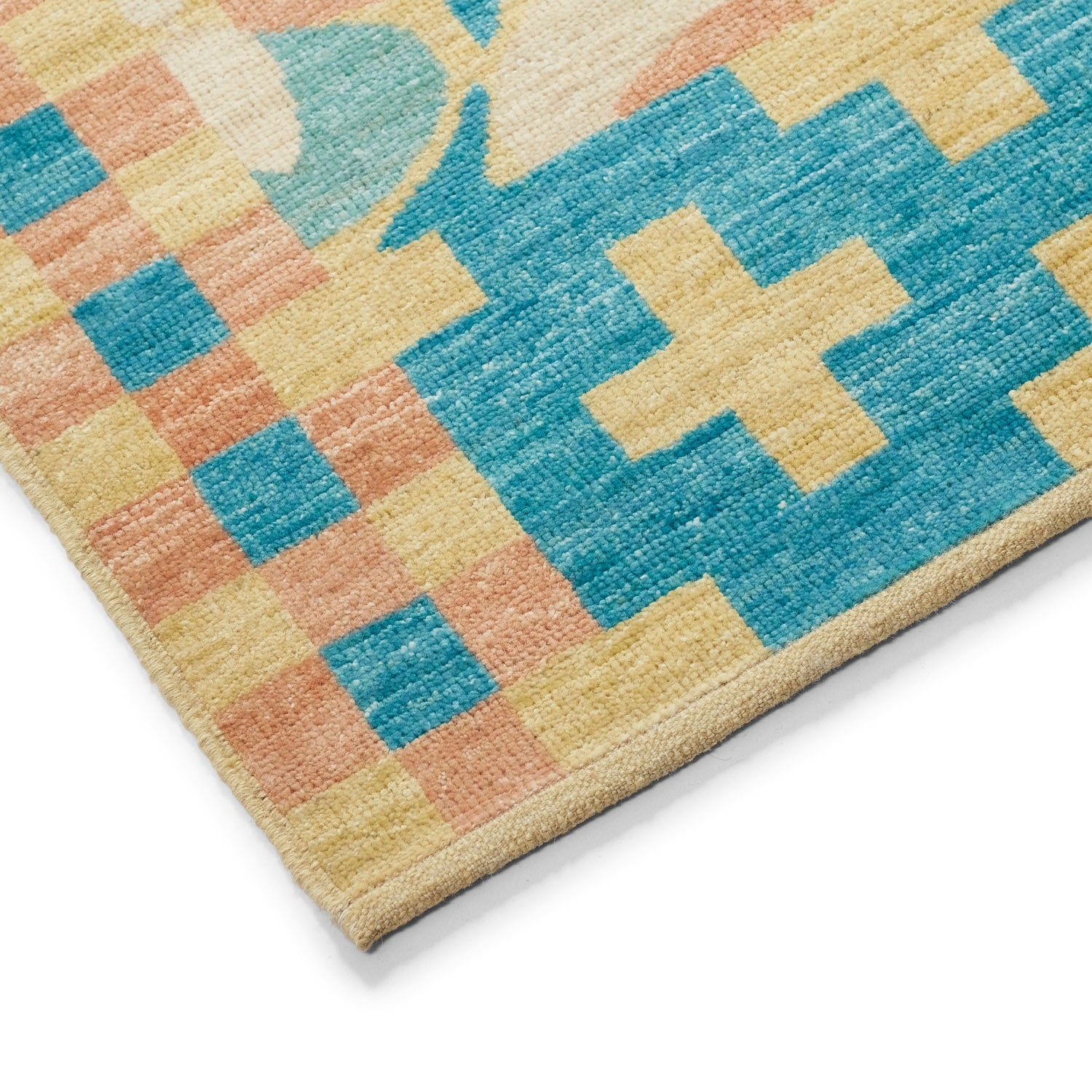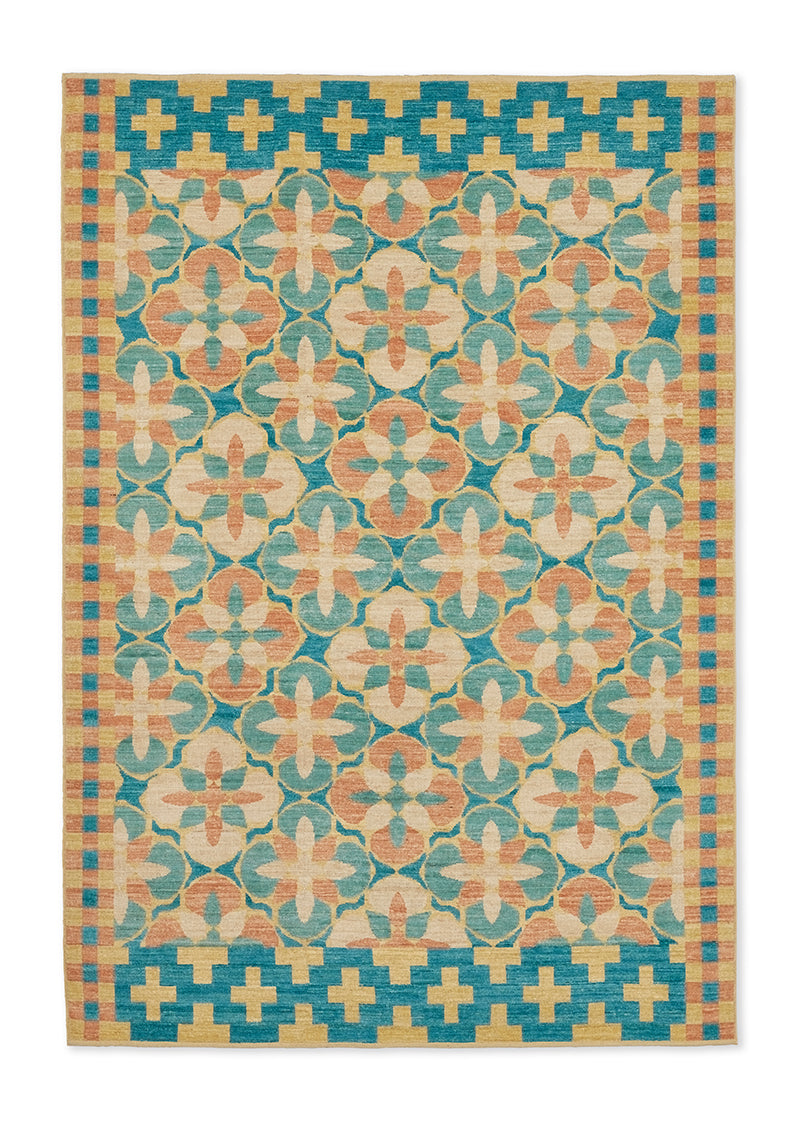 Surface designer Gill Thorpe has designed a series of contemporary, vintage-style rugs inspired by traditional motifs but brought into a modern context with vibrant colour combinations. Each rug is made using traditional hand-knot techniques and handcrafted by weavers based in Afghanistan. Woven with high-quality Ghazni wool, a regional wool known for its curled texture, the rugs feature a grainy effect when dyed, adding a distinct character to the weave.