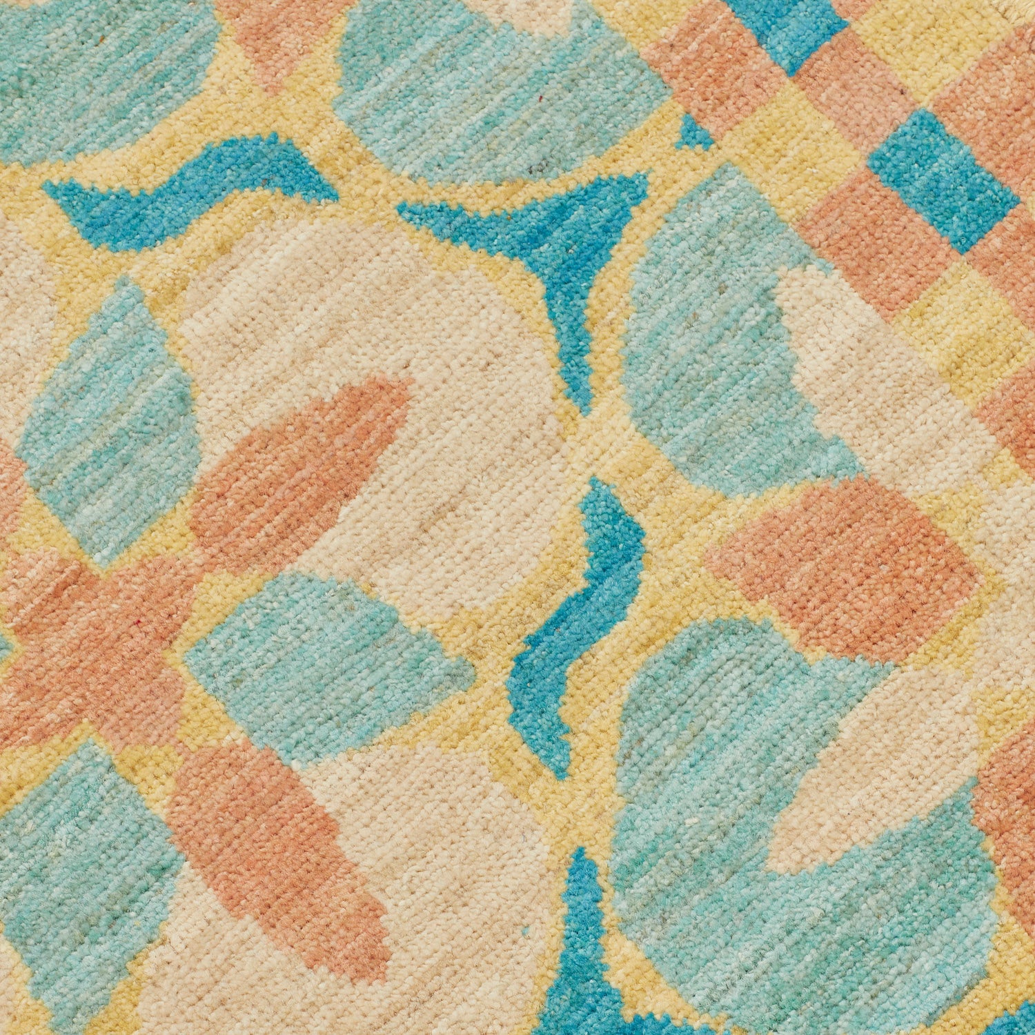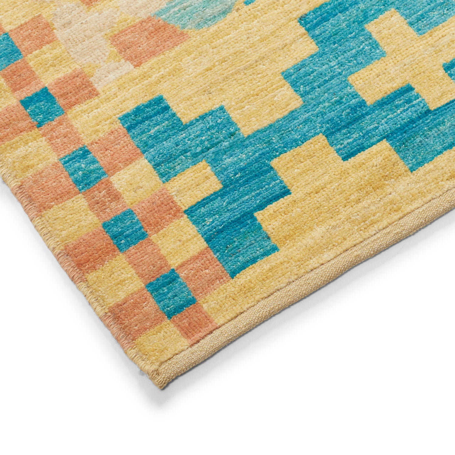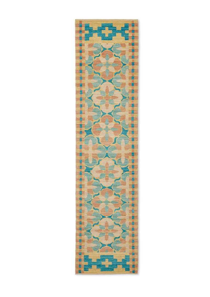 Surface designer Gill Thorpe has designed a series of contemporary, vintage-style rugs inspired by traditional motifs but brought into a modern context with vibrant colour combinations. Each rug is made using traditional hand-knot techniques and handcrafted by weavers based in Afghanistan. Woven with high-quality Ghazni wool, a regional wool known for its curled texture, the rugs feature a grainy effect when dyed, adding a distinct character to the weave.