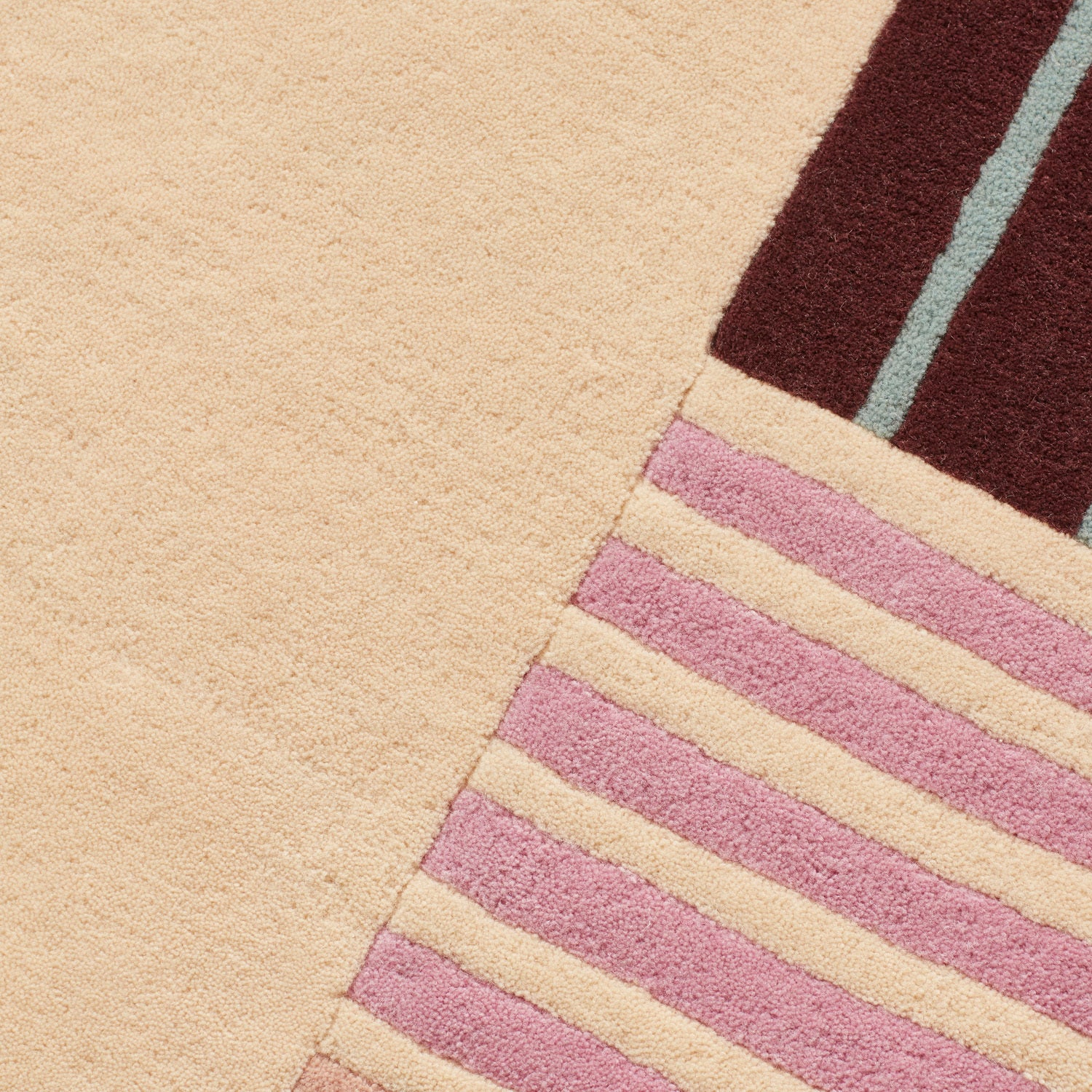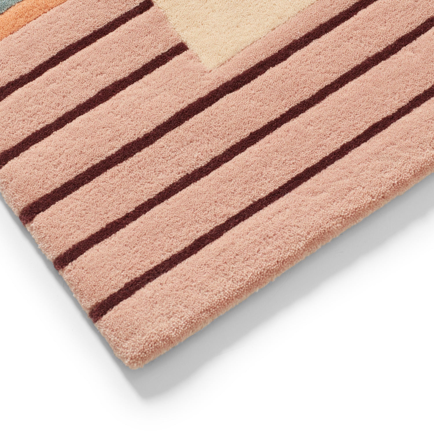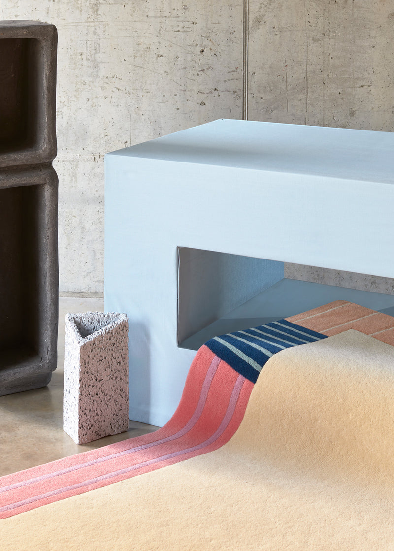 These cityscape influences have been translated into a series of colourways that recontextualise the unpolished inner city aesthetic. Gradient painterly textures contrast with linear bordered lines to give the tufted rugs depth whilst clean asymmetrical lines reveal an unconventional, flatwoven design.