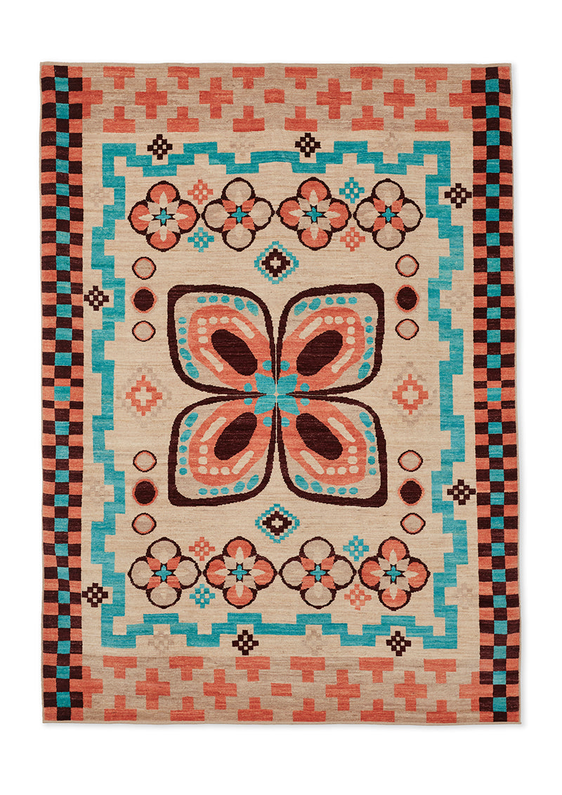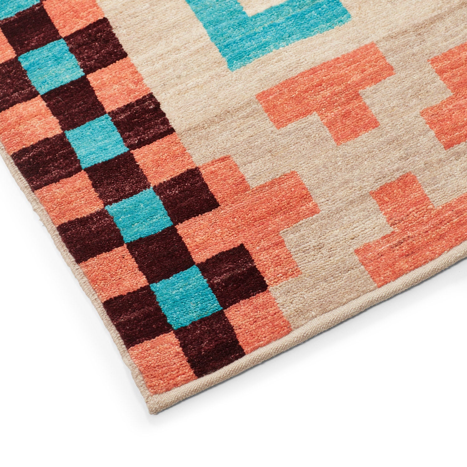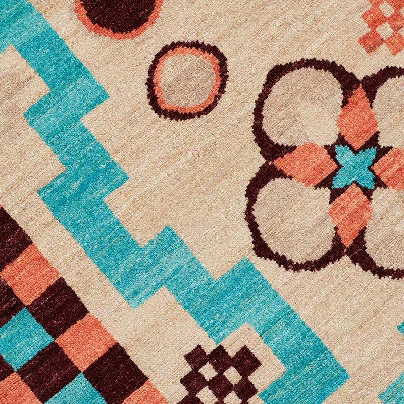 Surface designer Gill Thorpe has designed a series of contemporary, vintage-style rugs inspired by traditional motifs but brought into a modern context with vibrant colour combinations. Each rug is made using traditional hand-knot techniques and handcrafted by weavers based in Afghanistan. Woven with high-quality Ghazni wool, a regional wool known for its curled texture, the rugs feature a grainy effect when dyed, adding a distinct character to the weave.