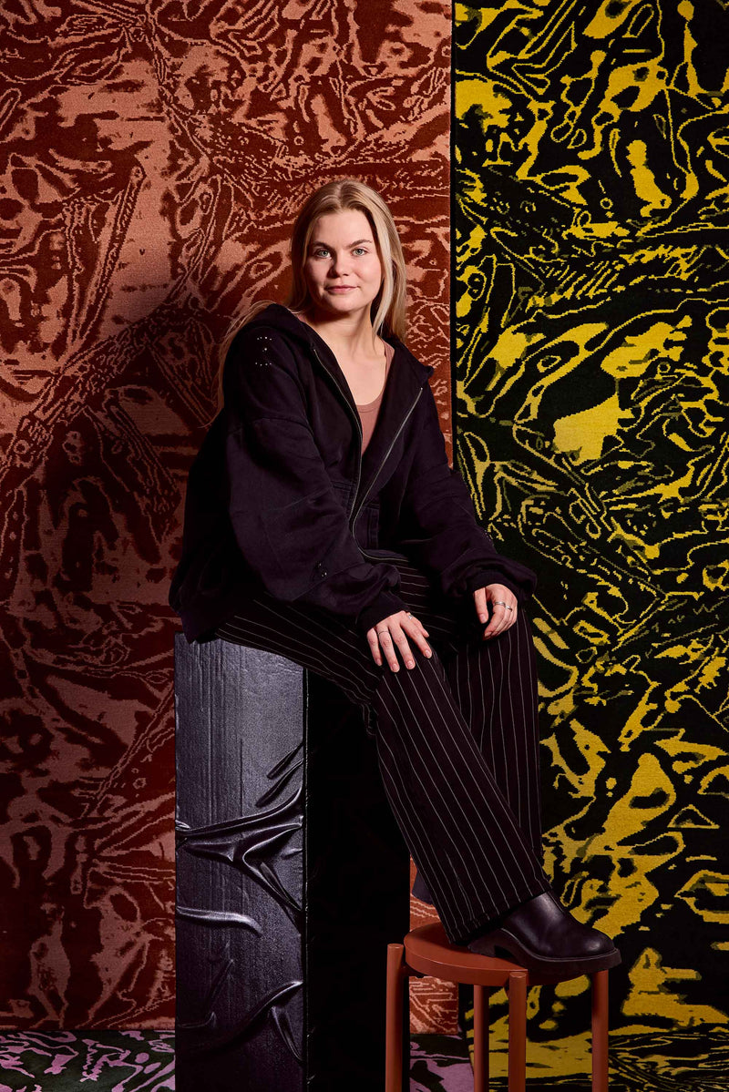 Unusual shapes cascading across the rug alludes to a three-dimensional design which is then translated onto a flat, single pile rug. The DUCT rug design is born from an experimentation with duct tape, which involved manipulating the material to form a textural surface.