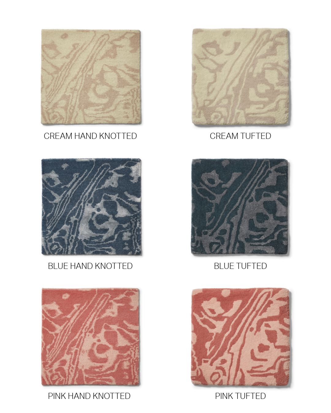 Unusual shapes cascading across the rug alludes to a three-dimensional design which is then translated onto a flat, single pile rug. The DUCT rug design is born from an experimentation with duct tape, which involved manipulating the material to form a textural surface.