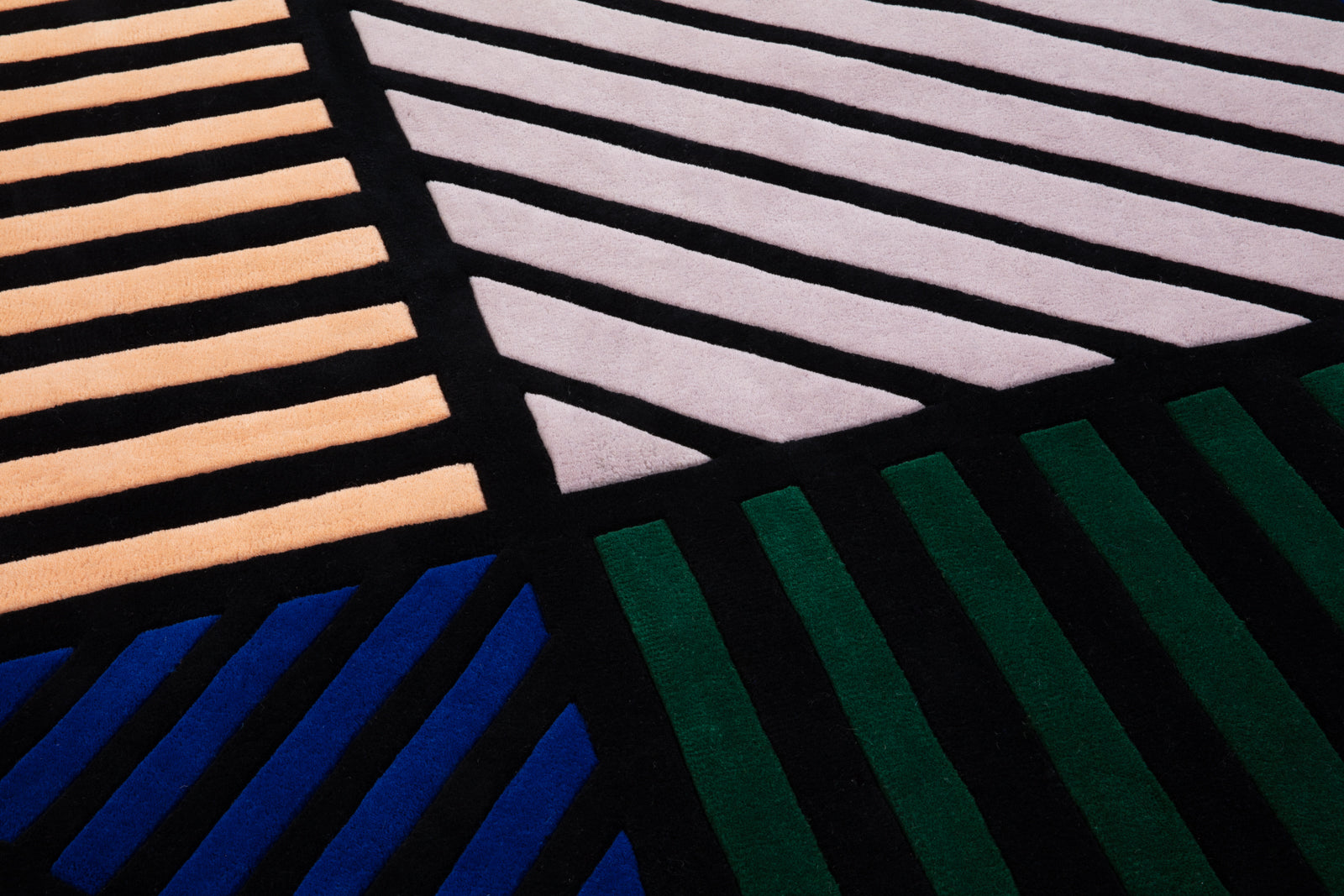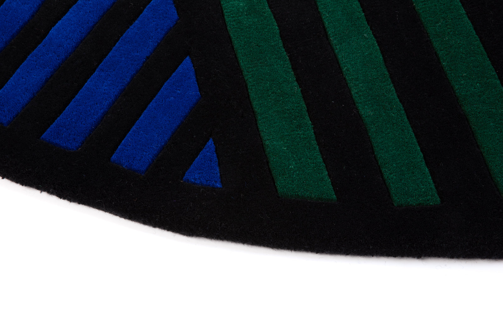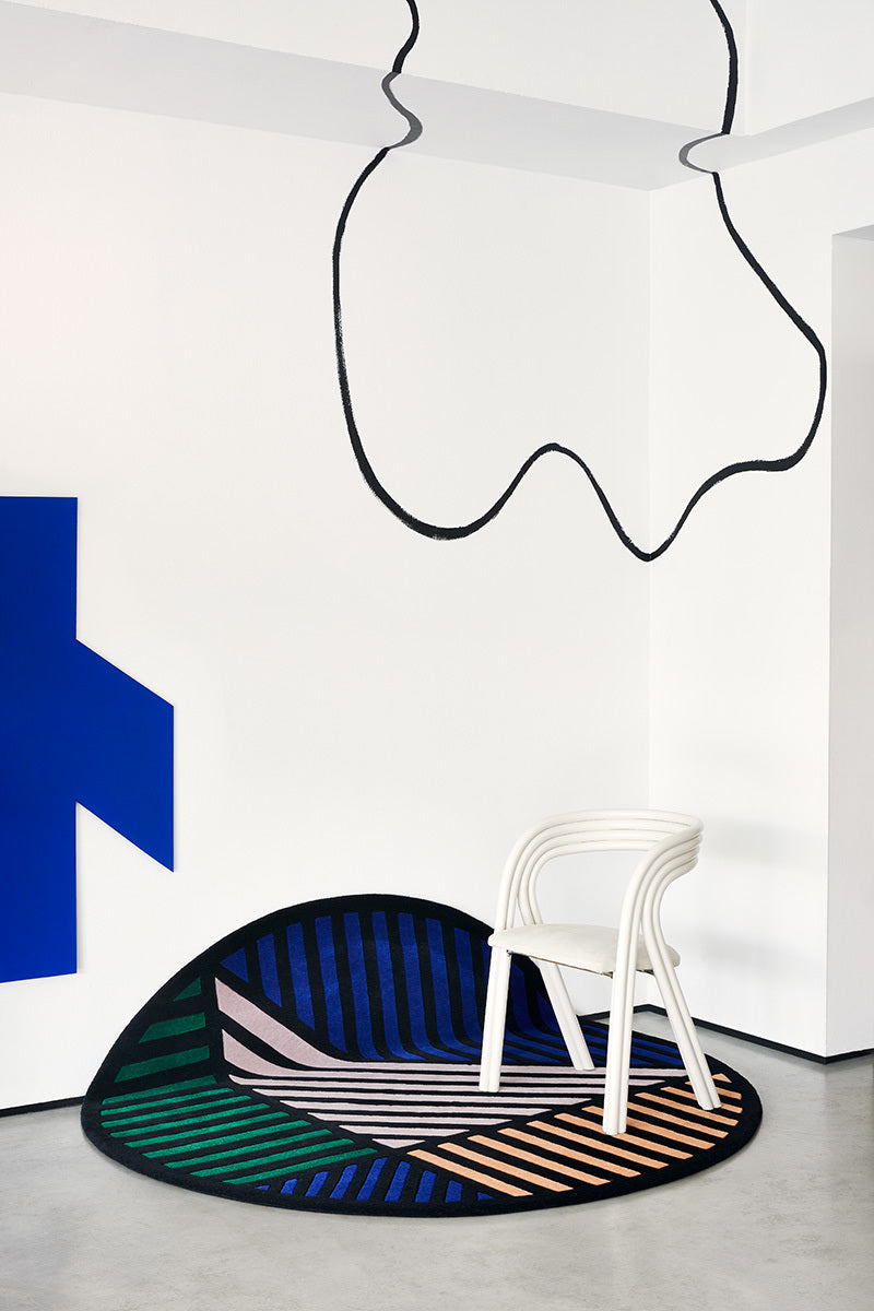 Camille Walala is famed for using courageous graphic shapes and primary colour to bring a pop feel to tribal inspired designs. In Ecliptic, Camille has brought a new dimension to her rugs for FLOOR_STORY, using a hand-tufted circle to frame a linear design in a colour palette rooted in sunshine yellow contrasting with deep blue and green.