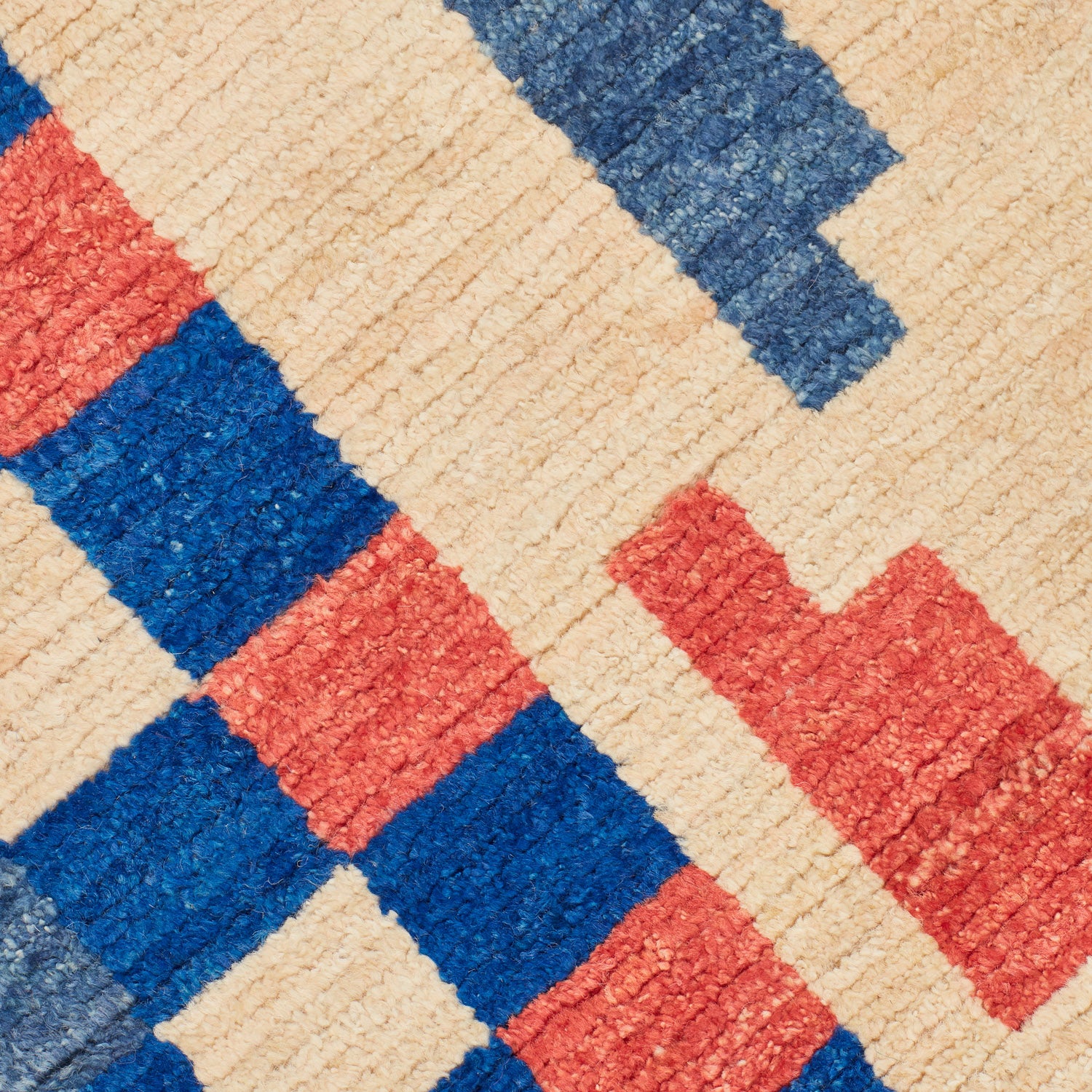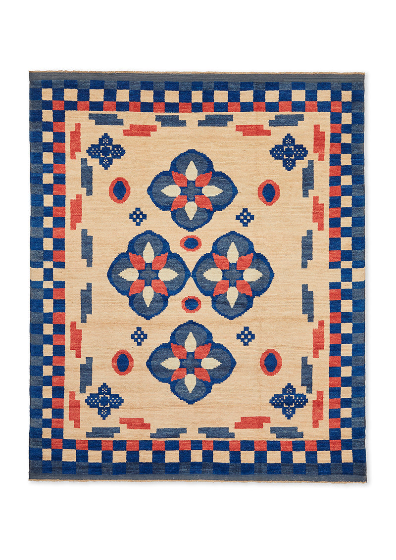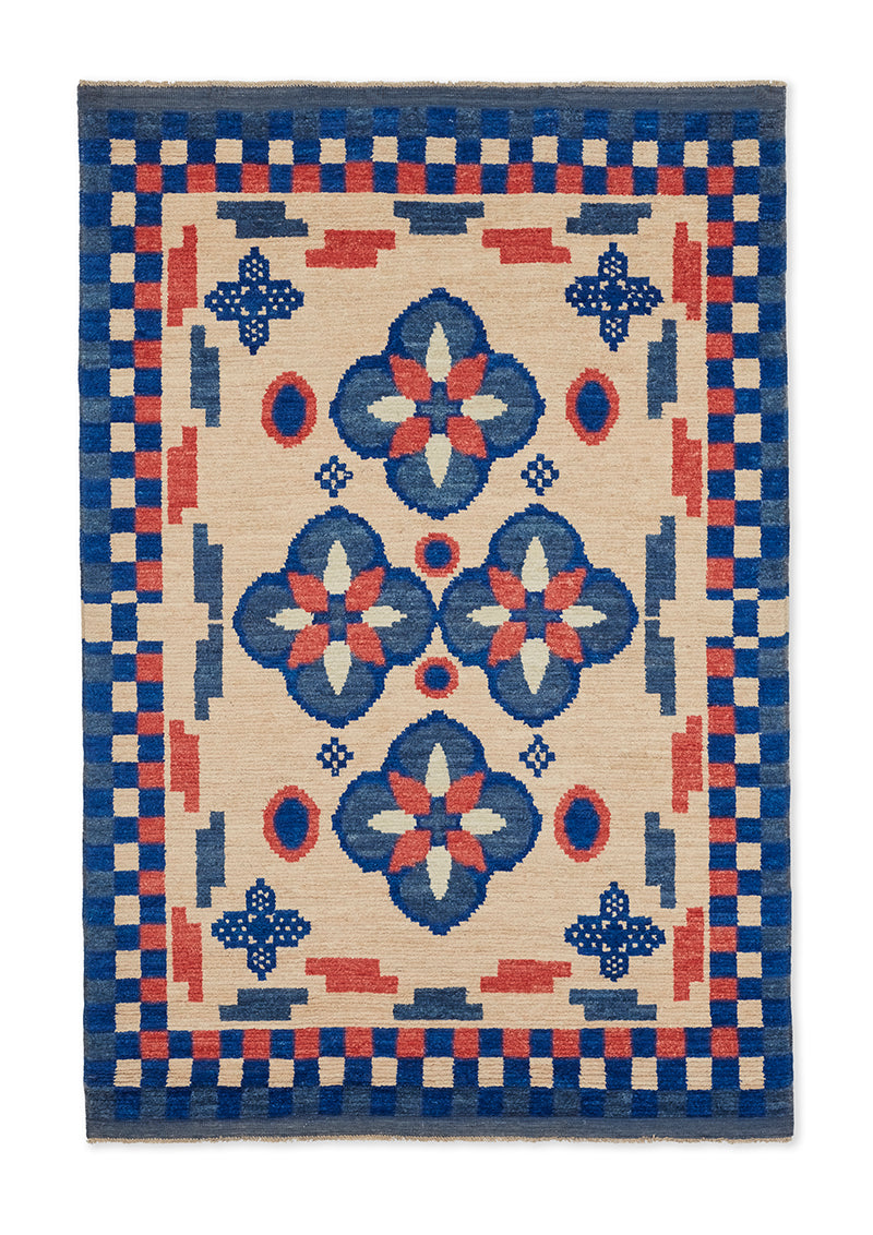 Surface designer Gill Thorpe has designed a series of contemporary, vintage-style rugs inspired by traditional motifs but brought into a modern context with vibrant colour combinations. Each rug is made using traditional hand-knot techniques and handcrafted by weavers based in Afghanistan. Woven with high-quality Ghazni wool, a regional wool known for its curled texture, the rugs feature a grainy effect when dyed, adding a distinct character to the weave.