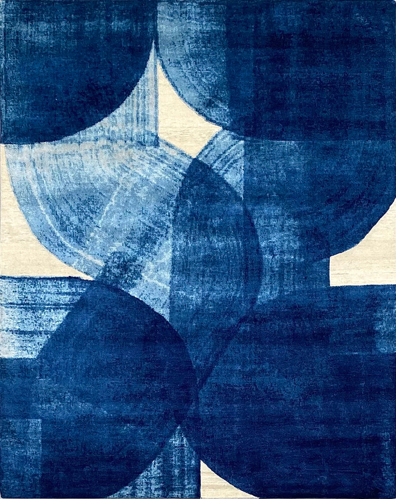 This contemporary rug is a combination of playful and sophisticated patterns that are hand-knotted using the finest New Zealand wool and silk. The rich mixture of these fibers create spectacular colourations and textures. This cool rug will fit into any space with its cool blue tones and elegant aesthetic.