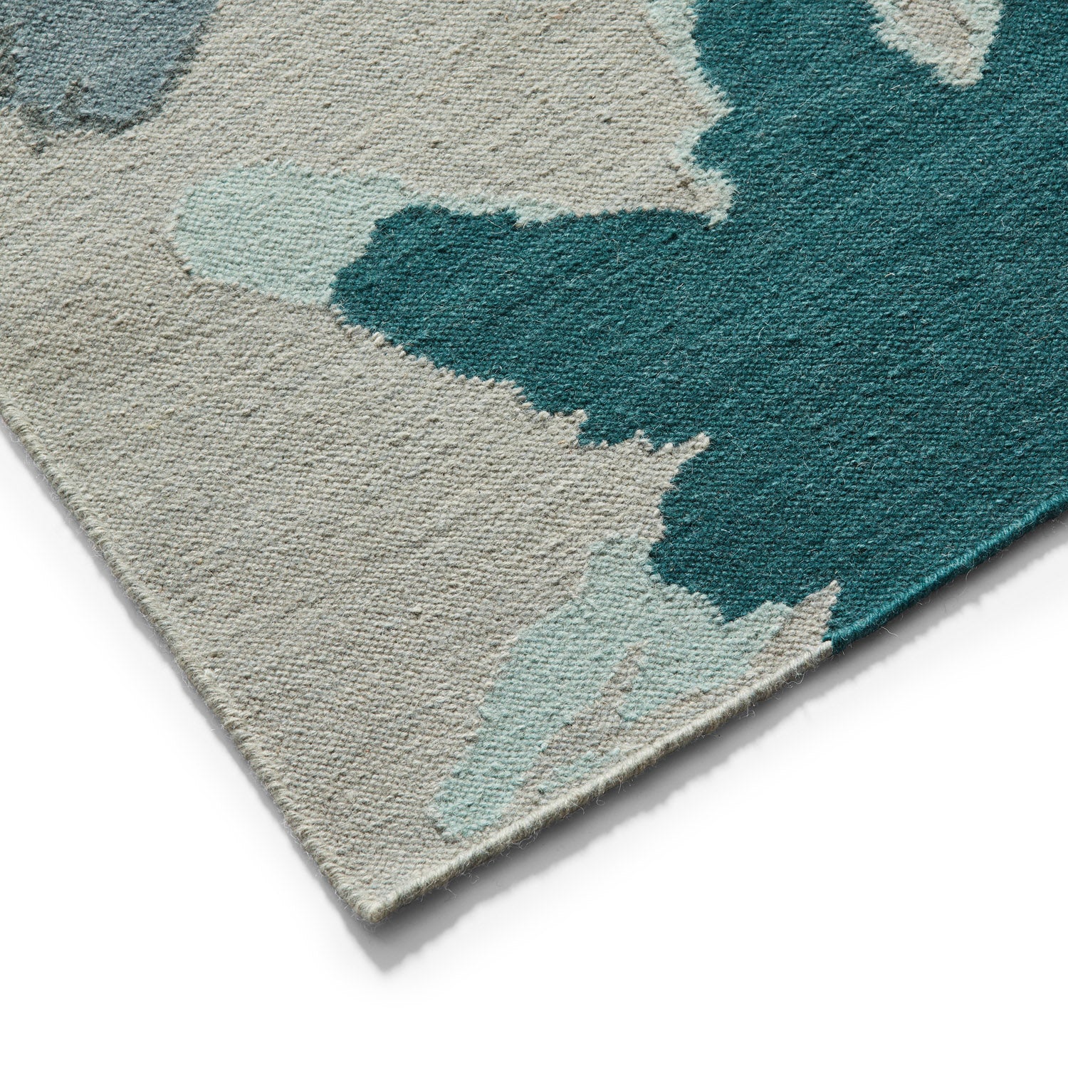 A floral flatwoven rug with painterly blue tonal flowers repeated over a pale mint woollen backdrop.