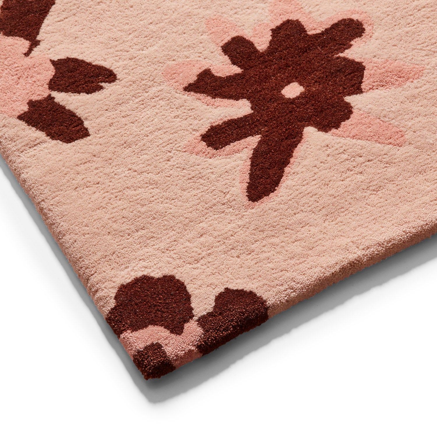 A floral tufted rug with painterly tonal flowers repeated over a pale pink woollen backdrop.