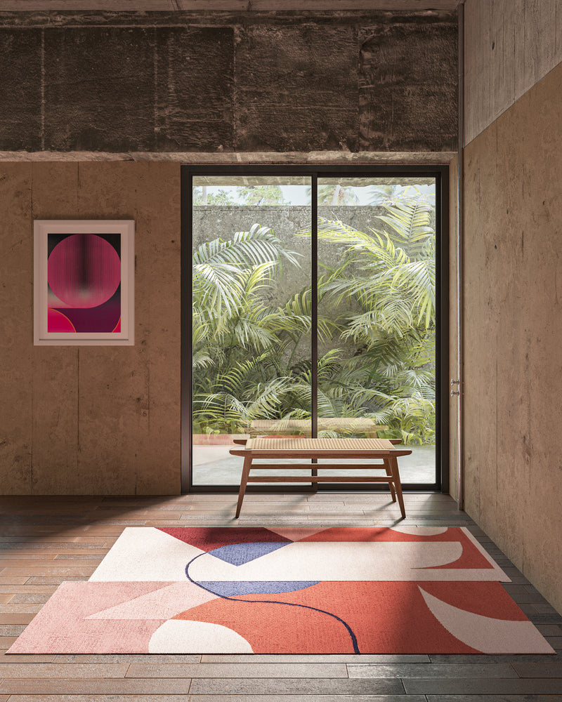 A compositional flatwoven rug design which subverts screen printing techniques into weave