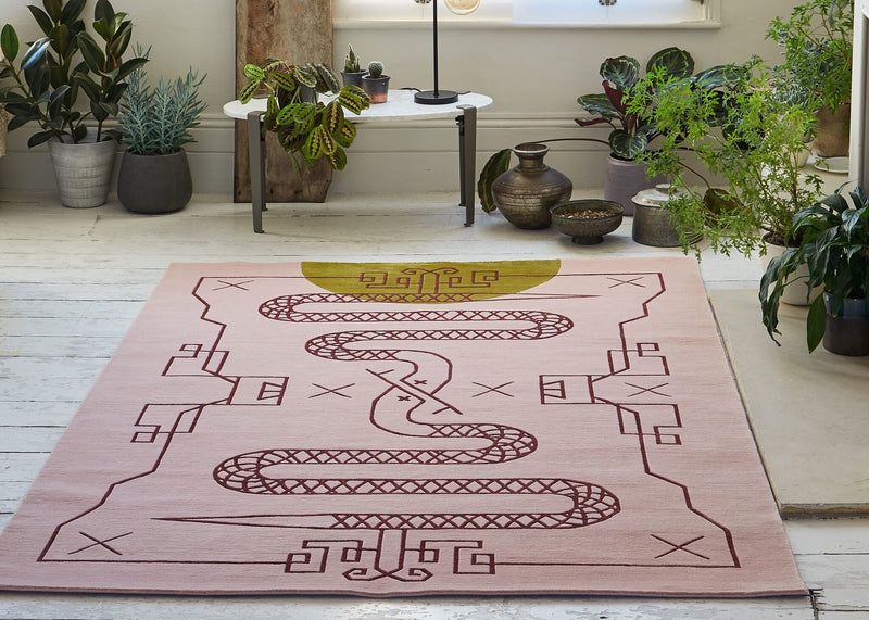 'It’s so hard to describe one’s work. I see Moth as an Art Deco double vision meets Chinese rug. Snake, I can only recount as an Aztec Gemini snake. I think it is the meaning behind that is more important than how the designs can be explained, they have a story to tell and it’s up to you how you read it. I wanted rugs that didn’t intrude, but rather that lifted and supported the room.'