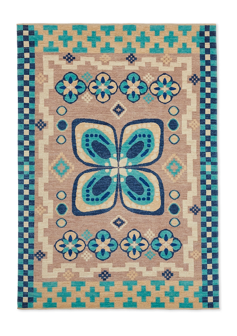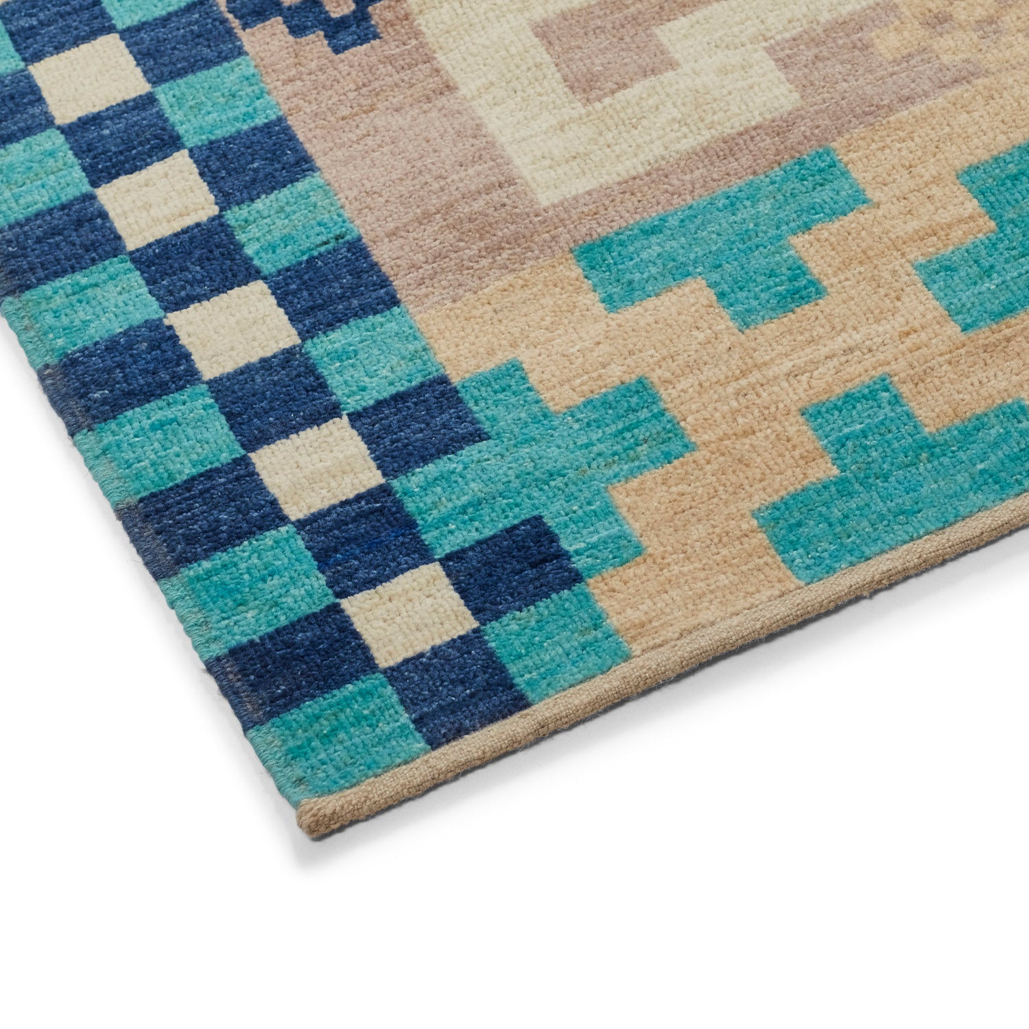 Surface designer Gill Thorpe has designed a series of contemporary, vintage-style rugs inspired by traditional motifs but brought into a modern context with vibrant colour combinations. Each rug is made using traditional hand-knot techniques and handcrafted by weavers based in Afghanistan. Woven with high-quality Ghazni wool, a regional wool known for its curled texture, the rugs feature a grainy effect when dyed, adding a distinct character to the weave.