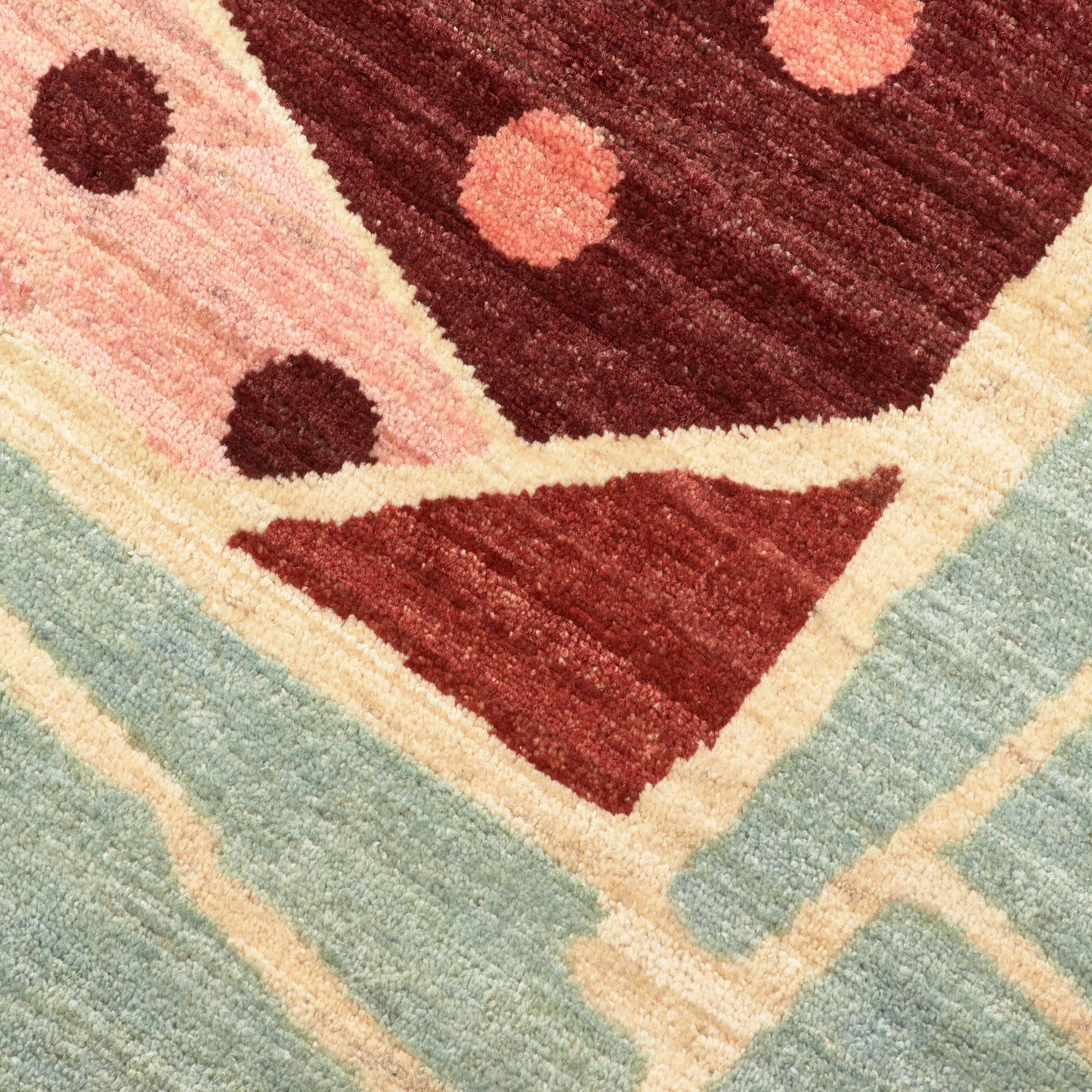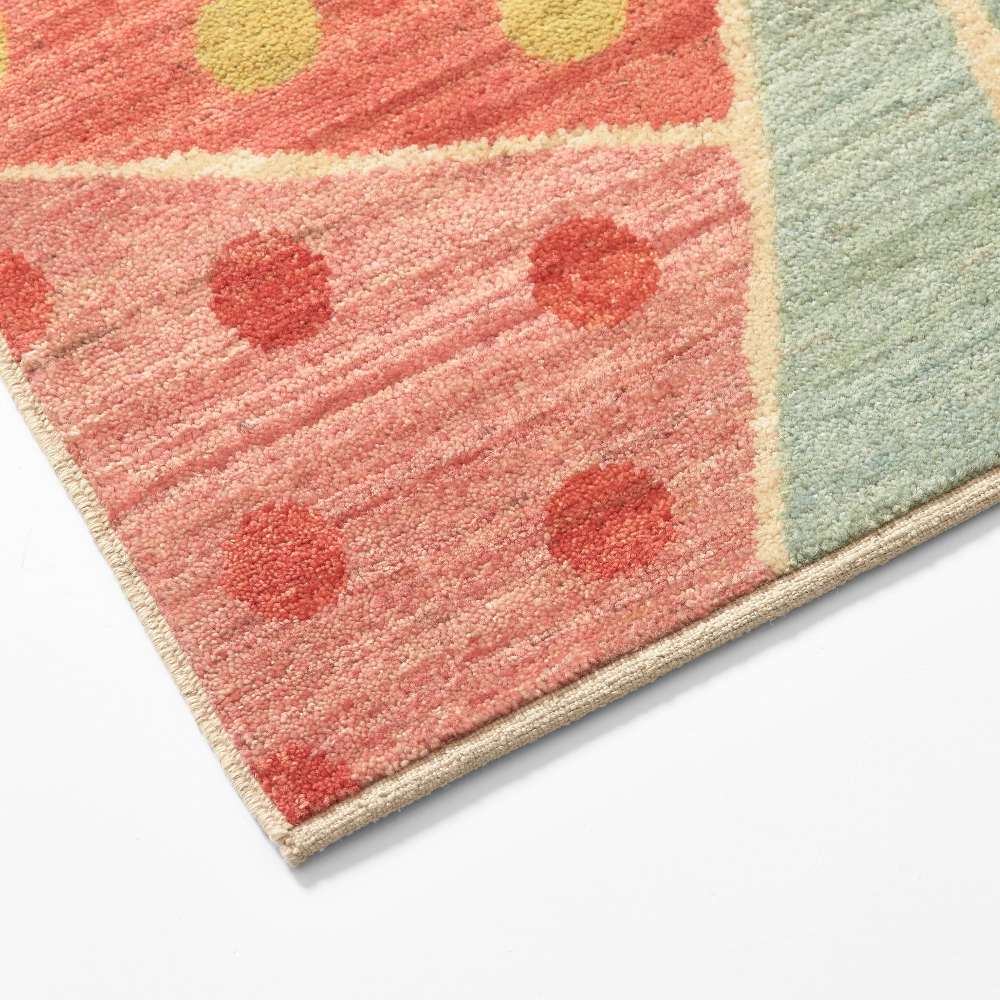 The textural Inset hand knotted rug from the Verso collection features layered brickwork and dotted squares in complimentary pink, green and blue tones.