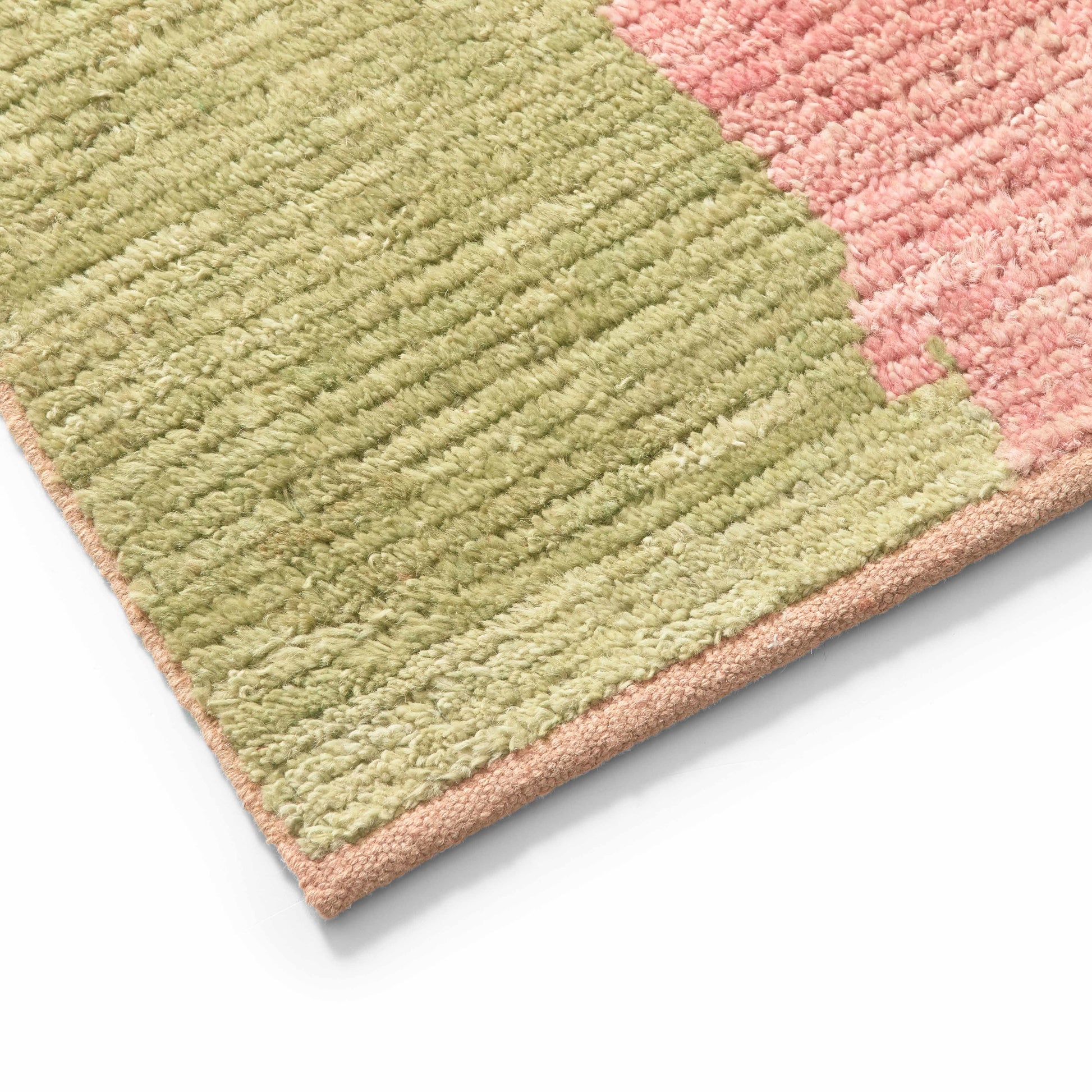 The textural Overlay hand knotted rug from the Verso collection features layered painterly lines in pink, green and blue tones.