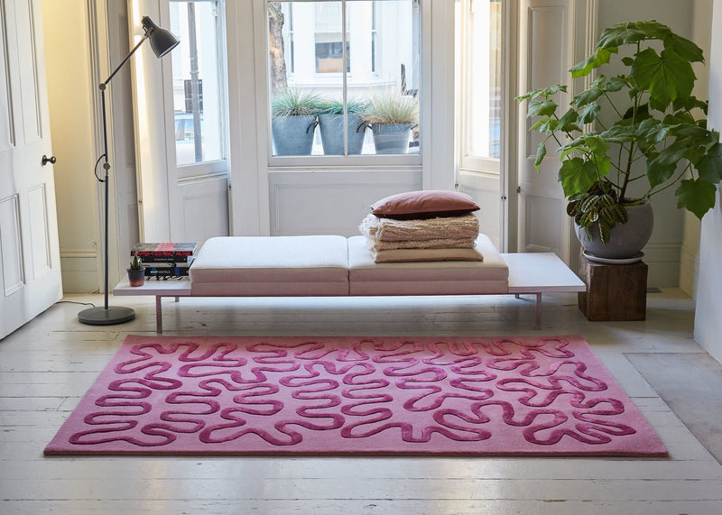 We are so excited to have collaborated with fashion icon Dame Zandra Rhodes. Zandra searched her archives and we have used 3 designs, Wiggle, Mexican Star and Star WarsWiggle is a signature design from the fashion house, we love its simplicity and use of bold colours. We have given the is piece extra dimension with the use of high and low piles.