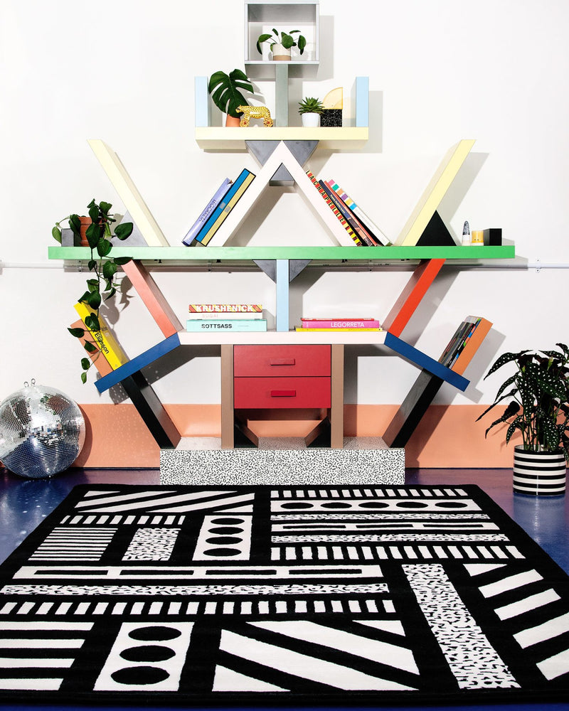 A bold, geometric black and white wool rug from Camille Walala.