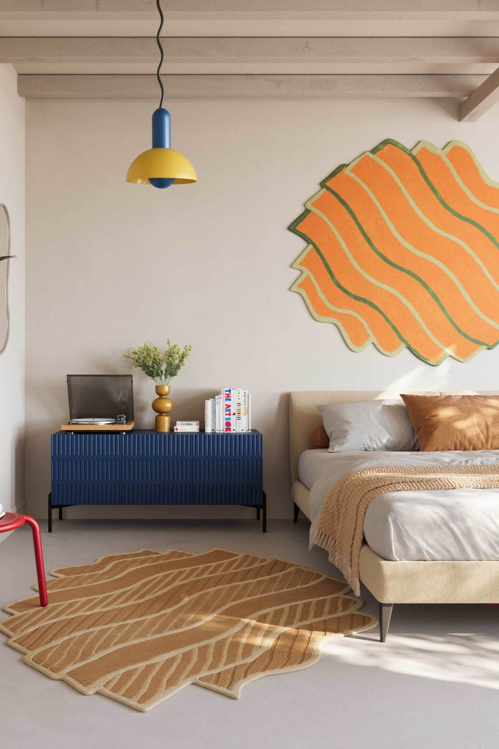 Shaped wool SCALLOP (wall) and DUNE (floor) rugs by Amechi Mandi in a contemporary bedroom