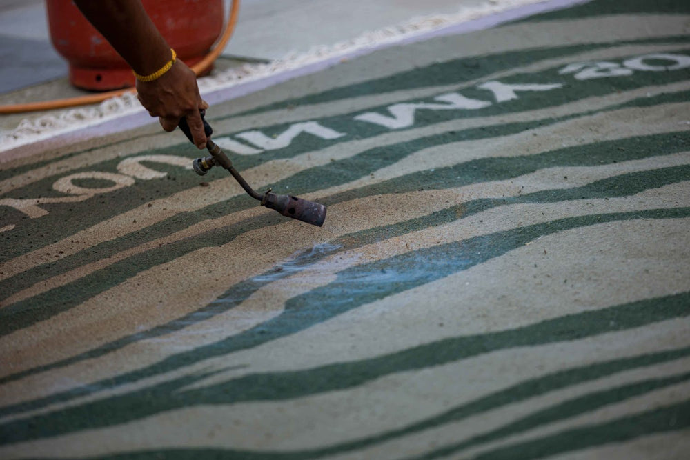 Process of burning away dirt and dust from hand knotted wool rug.