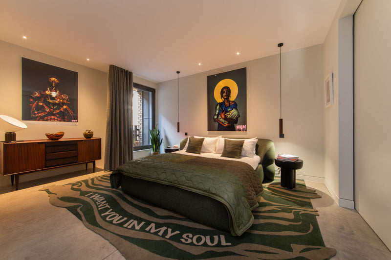 'I Want you In My Soul' hand knotted pictured in master bedroom, photographed by