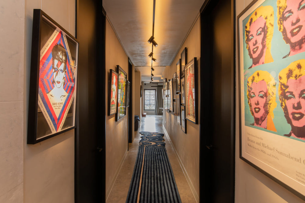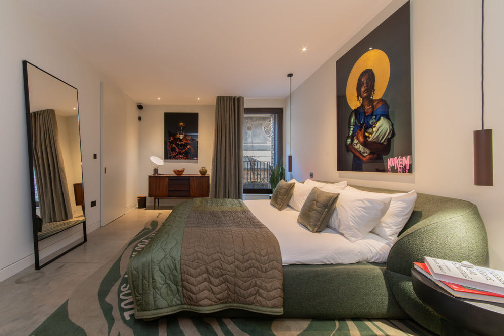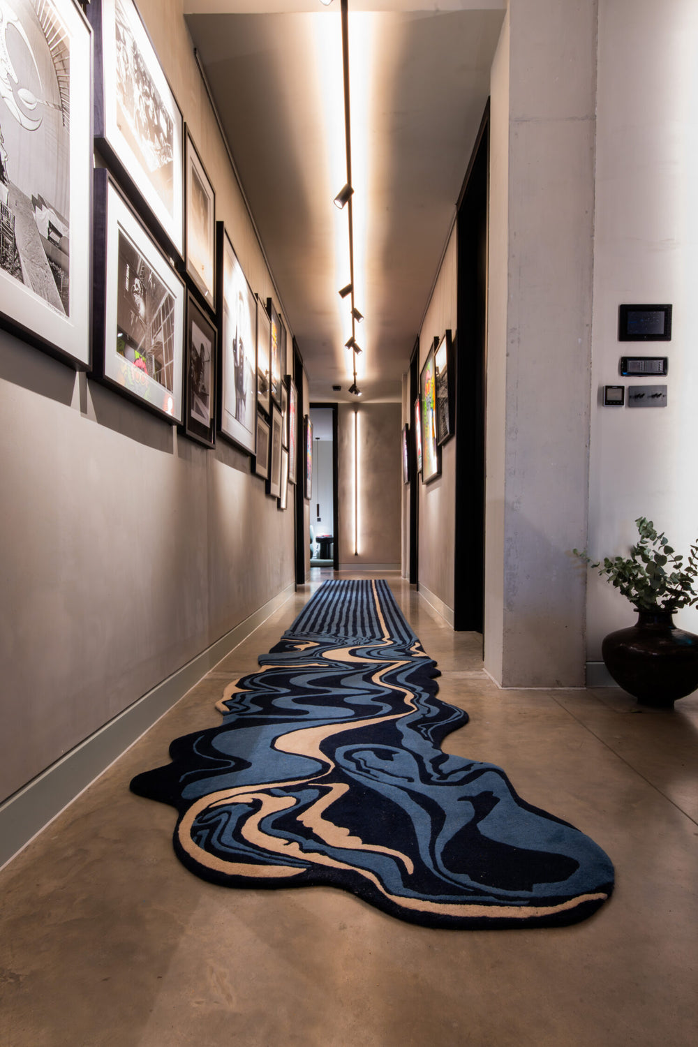 This custom 'I Want You In My Soul rug' was produced from the original I Feel Love rug design, made in collaboration with Henry Holland. This version sees tonal greens spill onto Dunmore's concrete floor of the master bedroom.